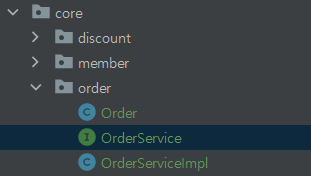 주문을 구현해주기 위해, order디렉토리를 생성한 후, 해당 디렉토리 하위에 Order 클래스, OrderService 인터페이스와 OrderServiceImpl 클래스를 생성해준다.