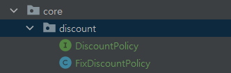 할인 코드를 구현해주기 위해, discount 디렉토리를 생성한 후, 해당 디렉토리 하위에 DiscountPolicy 인터페이스와 현재의 요구사항을 반영하여 고정 금액을 할인해주는 FixDiscountPolicy 클래스를 생성해준다.