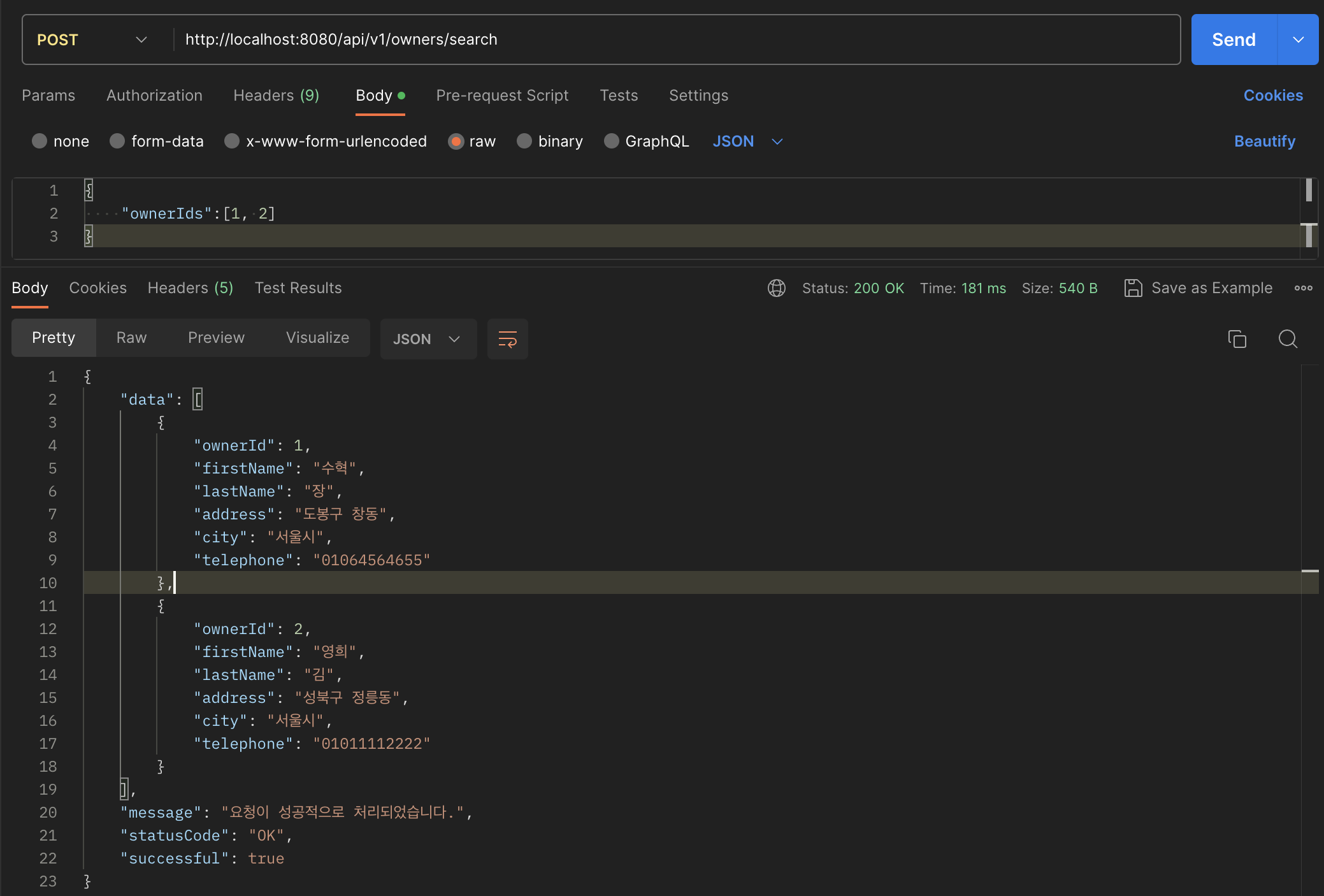 우선 검색값을 받아와야 하기에 기존의 Get방식으로 URL을 통해 ownerId값을 받는 것이 아니라, Post 방식으로 값을 받아와야하기에 위처럼 수정해주었다. 추가적으로 return값이 List로 넘어오기에 받아오는 return 값도 List로 수정해주었다.