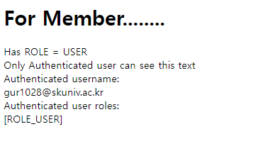 위의 코드 작성 후, 실행 시 Google로 로그인 하여도 정상적으로 email과 role이 출력되는 것을 볼 수 있다.