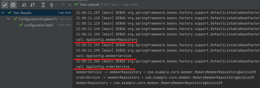 위처럼 테스트 코드를 작성하고 실행해보면, memberService, orderService 모두 동일한 memberRepository 인스턴스를 공유하여 사용하는 것을 확인할 수 있다. 위의 AppConfig 클래스를 보면 각각 new MemoryMemberRepository를 호출해서 다른 인스턴스가 생성되는것 처럼 보이지만 그렇지 않다는 것이다. 이를 더 자세히 알아보기 위해 다음과 같이 호출 로그를 작성해줄 것이다.